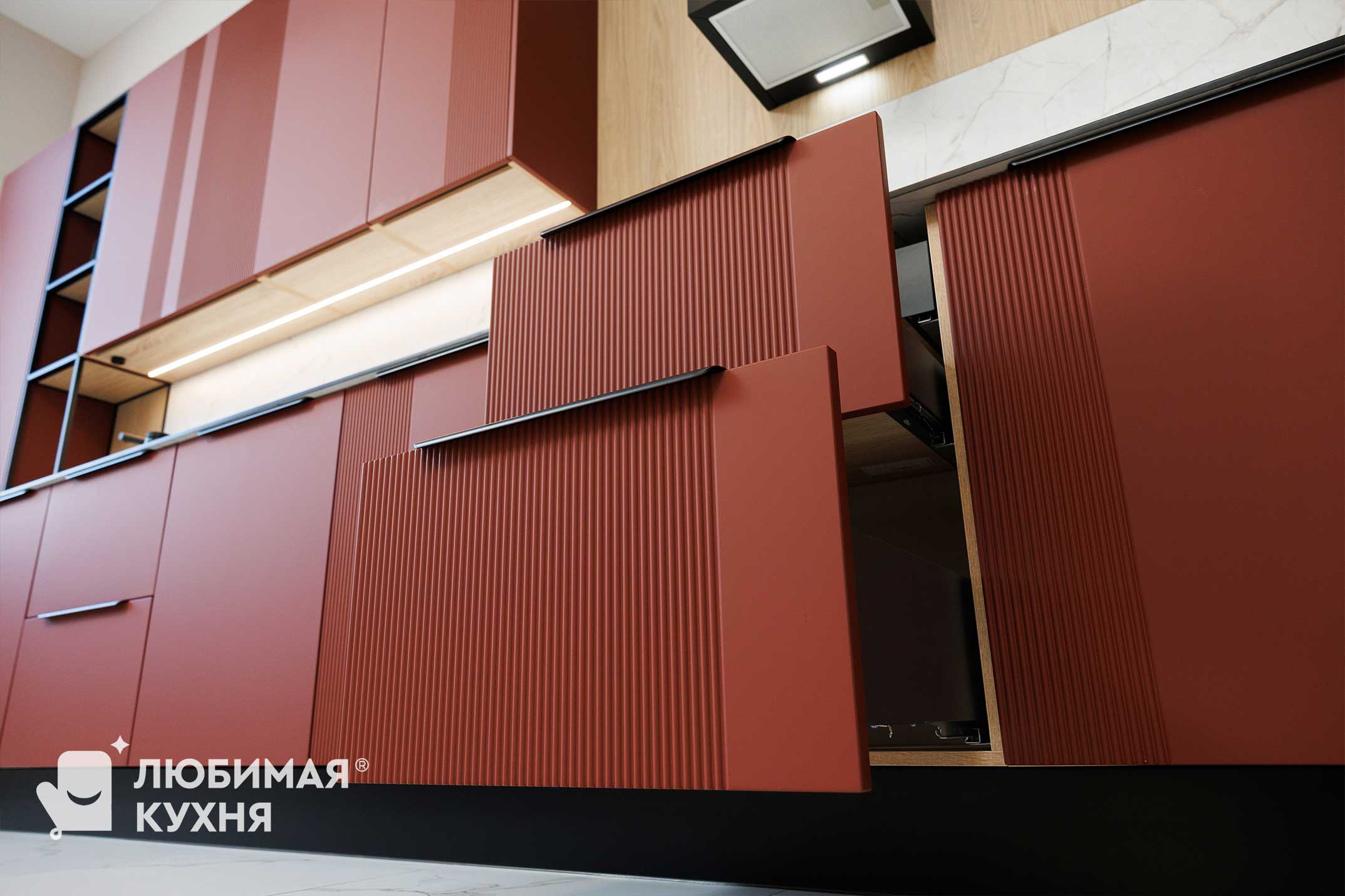 Современная кухня с контрастным сочетанием оттенка бордо и светлых деревянных фасадов. Главный акцент — высокий пенал с открытыми полками в чёрном металлическом каркасе, создающий эффект лёгкости. Фартук и столешница из белого мрамора с серыми прожилками гармонично связывают композицию. Чёрные ручки-профили, смеситель и бытовая техника подчёркивают графичность линий. Трековое освещение и минималистичный дизайн делают интерьер функциональным и стильным.