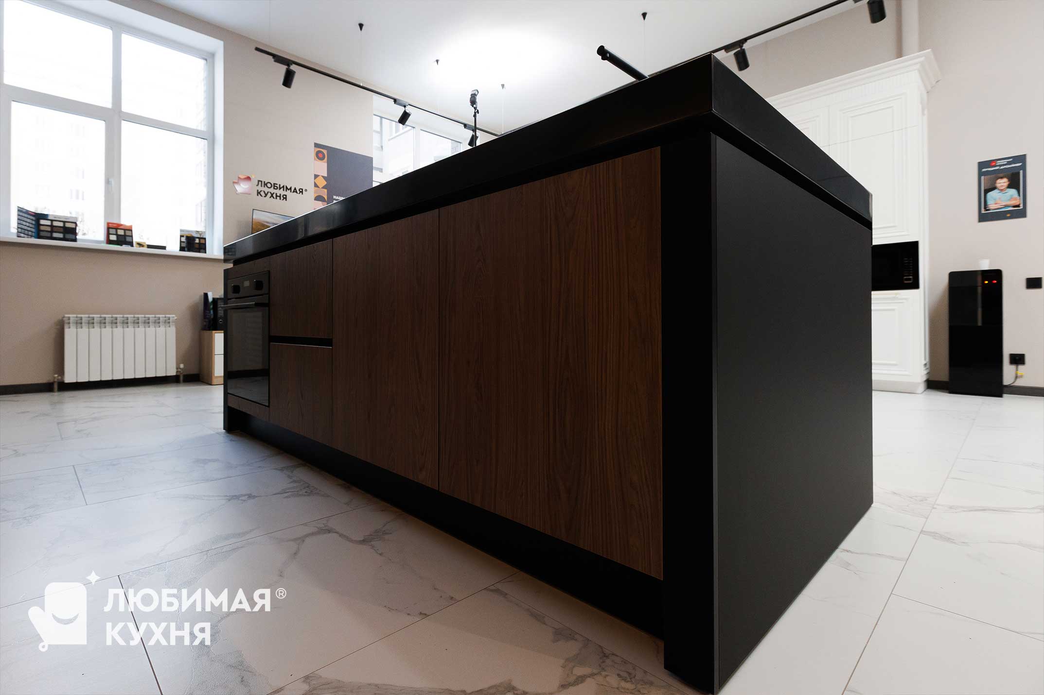 верх и пеналы фасады Mattelux Черный премиум, низ ЛДСП H1386 ST40 Дуб Кассела коричневый, витрины профиль алюминиевый ЧЕРНЫЙ ,стекло тонированое Графит